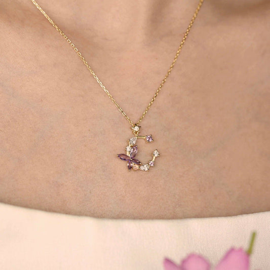 Monarch Butterfly Amethyst Opal Necklace (Yellow Gold)