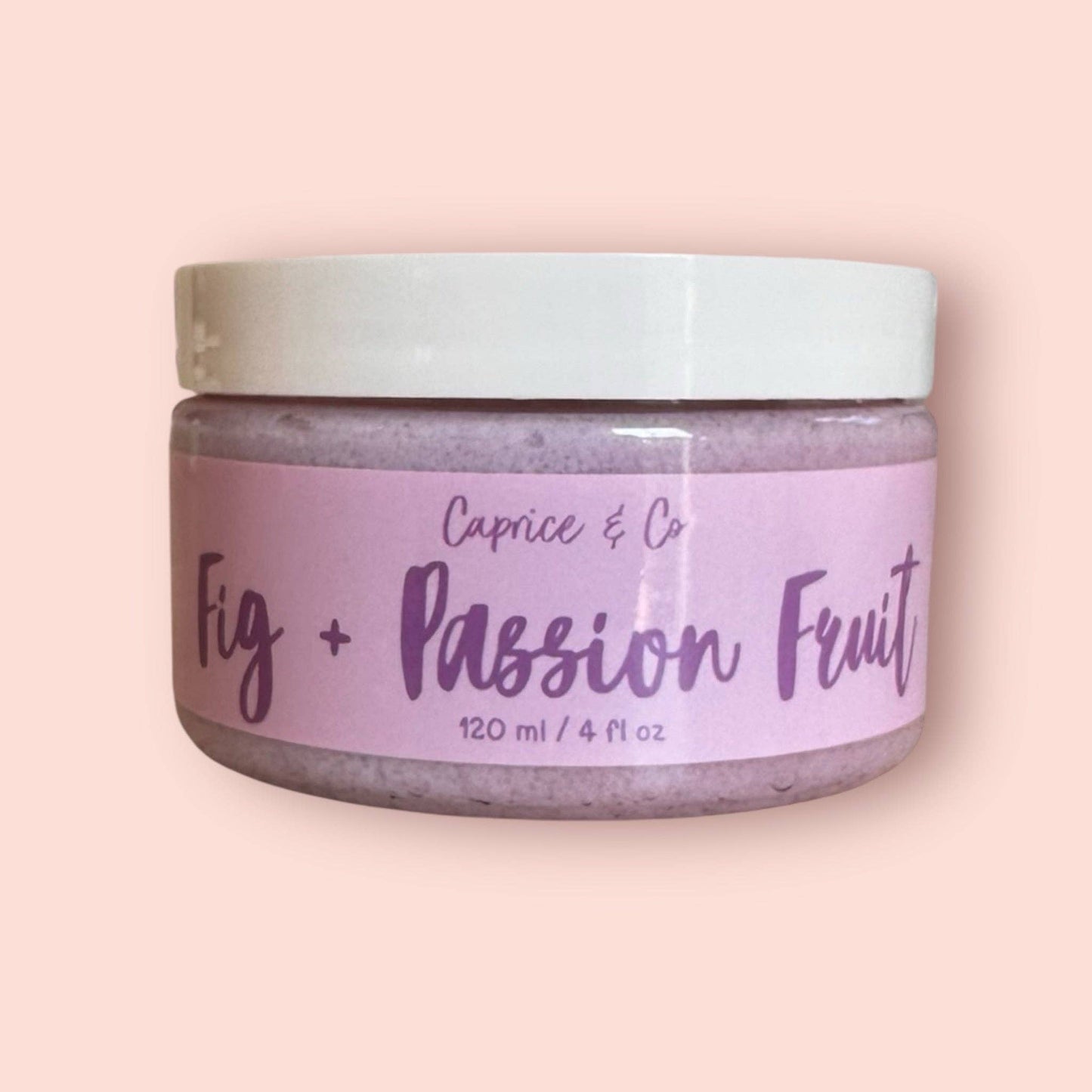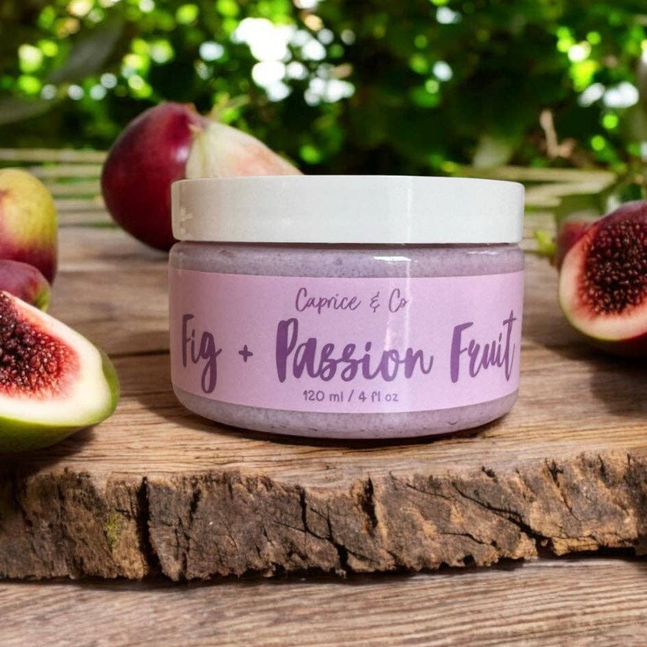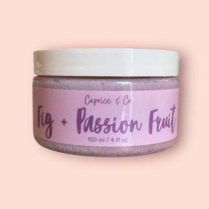 Natural Sugar Scrub 4 fl oz. Scent: Fig + Passion Fruit Our 100% natural Foaming Body Scrubs are a fun, refreshing way to pamper your skin!
