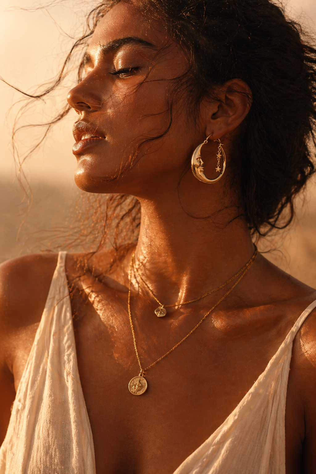 The Luna Hoops trace the curve of the moon in its most intimate form—soft, watchful, and impossibly magnetic. Sculpted in gold with a delicate celestial drop, each pair captures that moment where stillness meets wonder.