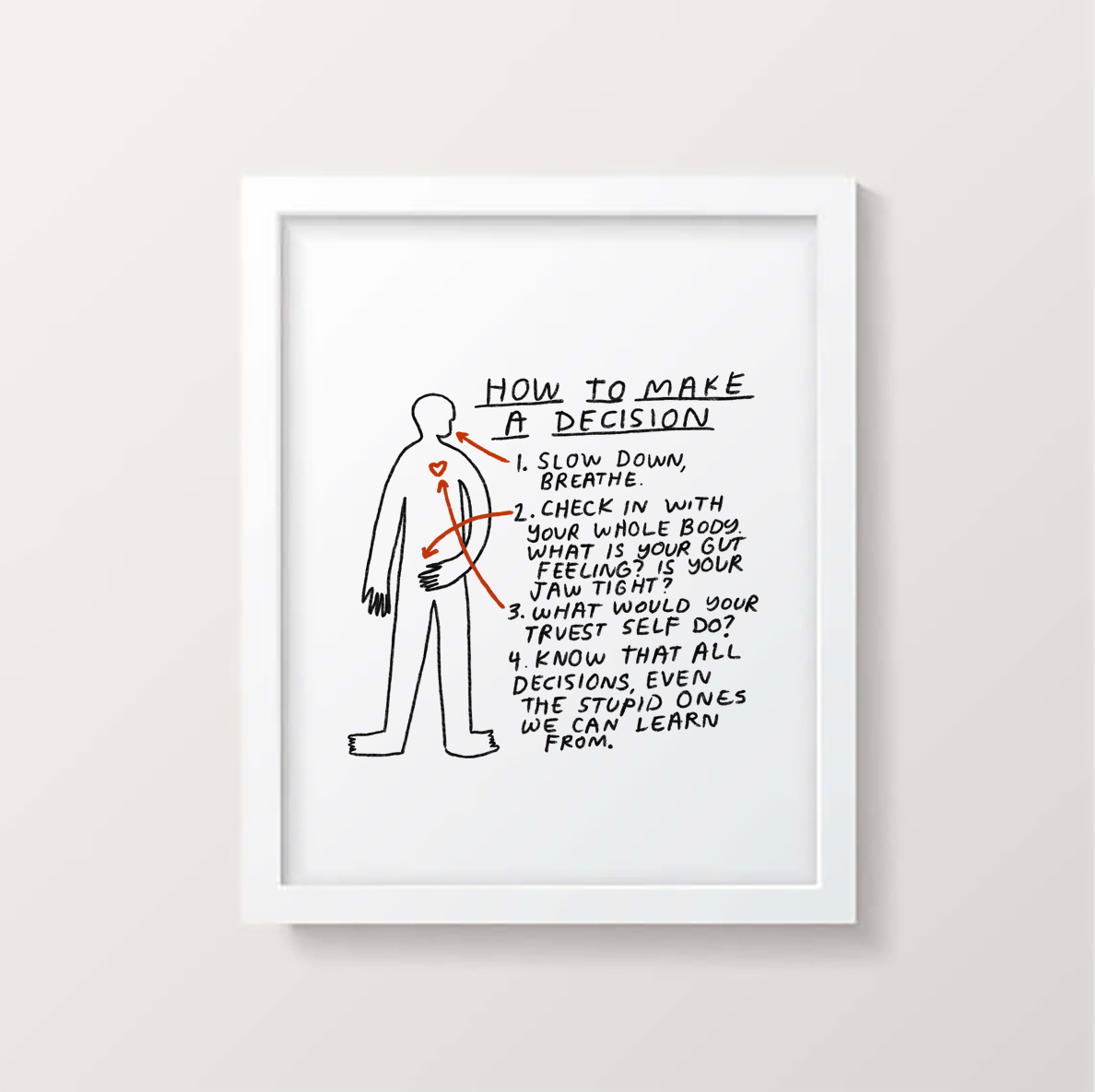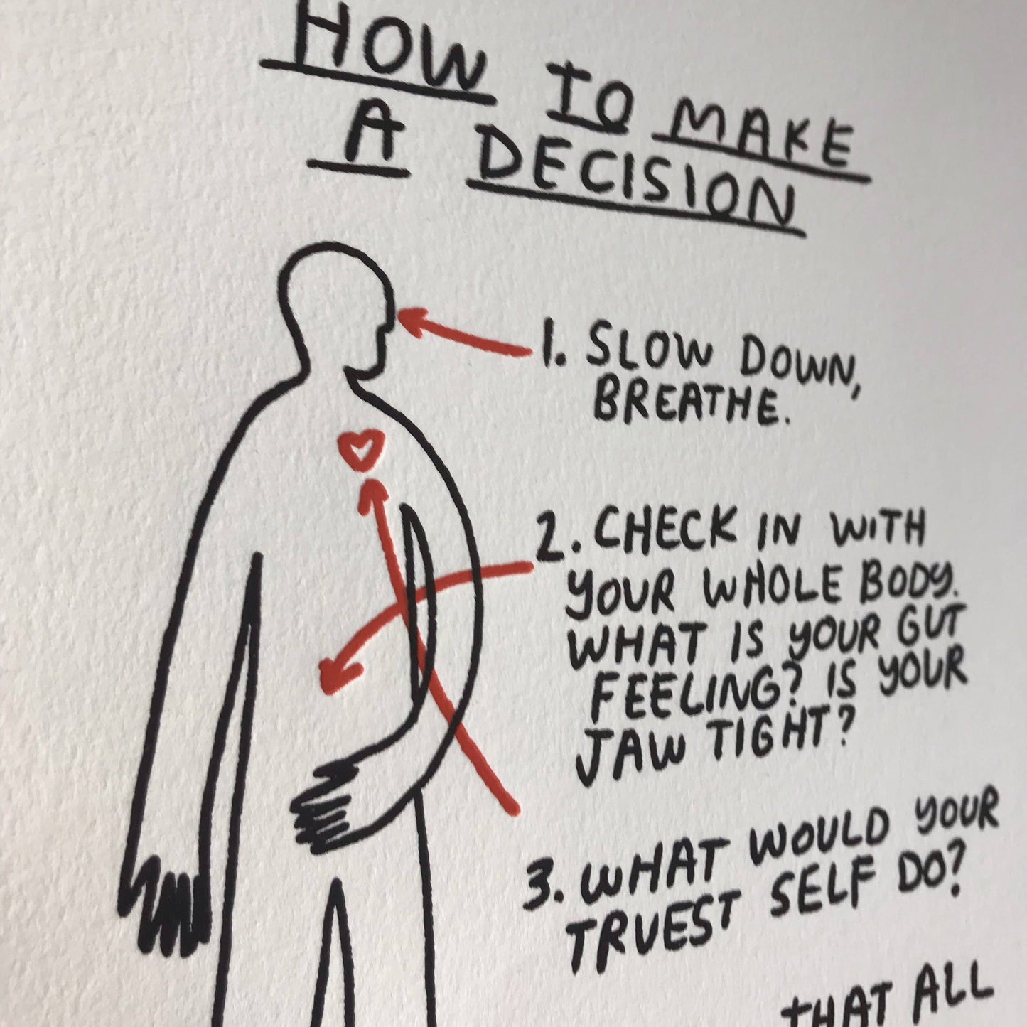 Decisions are hard, but this diagram can help you through the tough spots. Slow down, get connected with your heart, emotions, and body. Find your best way through life. 8" x 10" Two-color letterpressed by hand on 100% cotton Cranes 110 lb lettra paper. Does not include the frame.