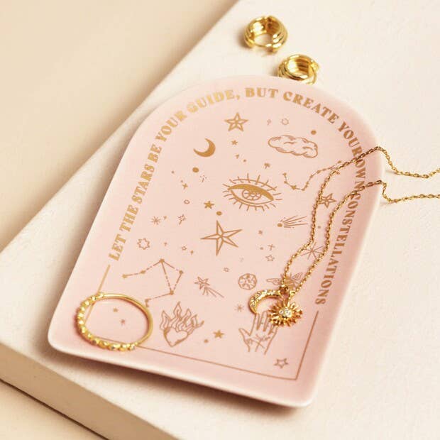 With a pink background adorned with an array of cosmic motifs, this pattern includes constellations, stars, moons and clouds amongst other symbols in a shining gold shade. Encasing this print is the quote 'Let the stars be your guide, but create your own constellations' in a matching gold.