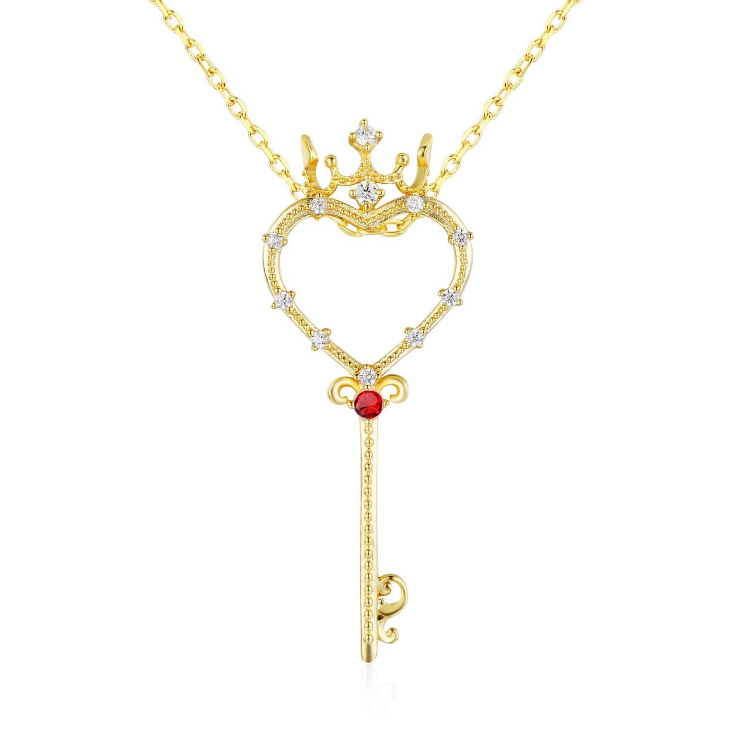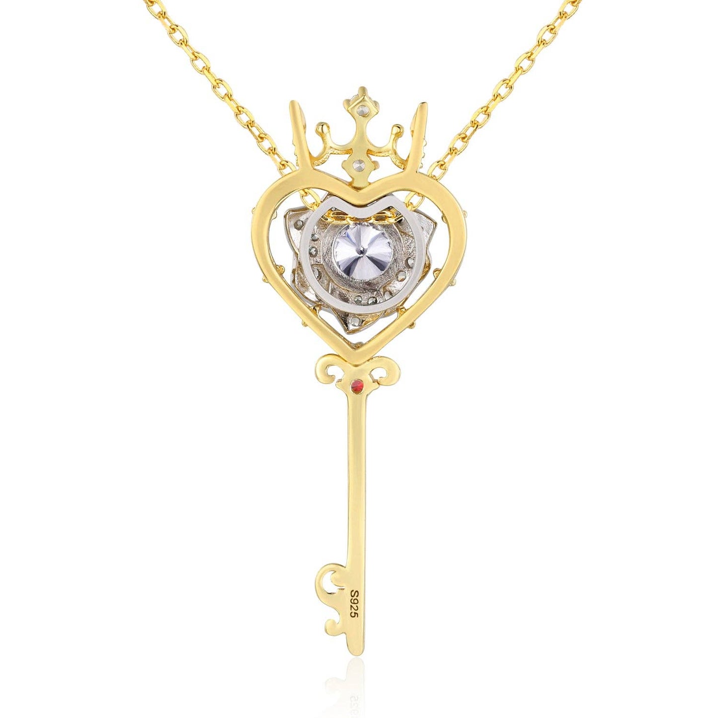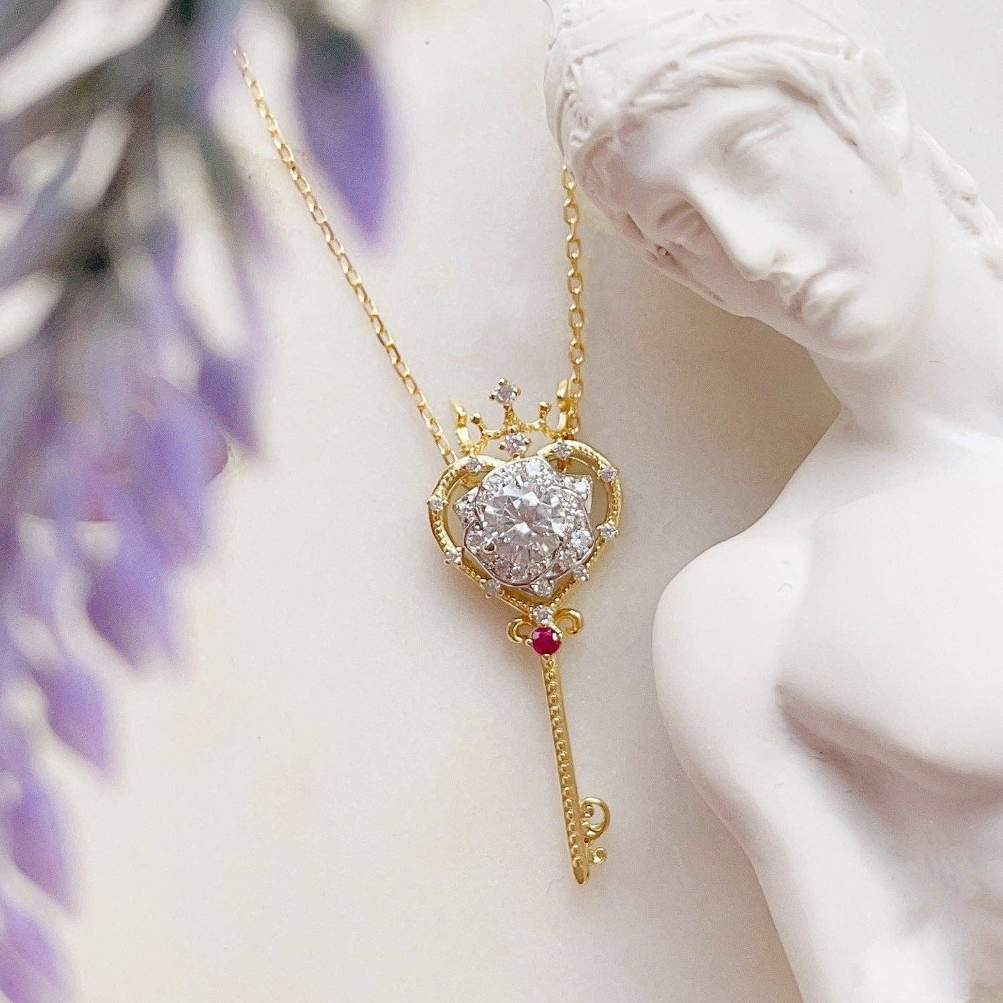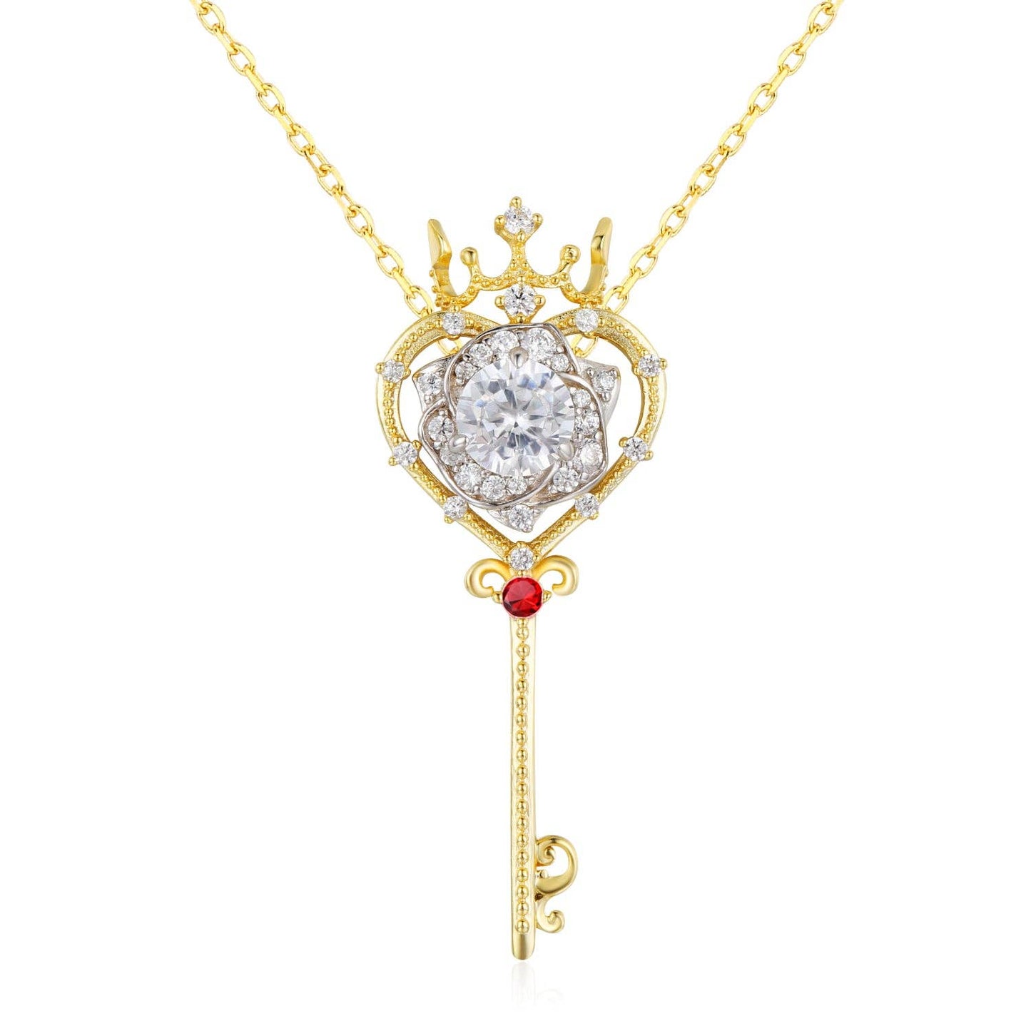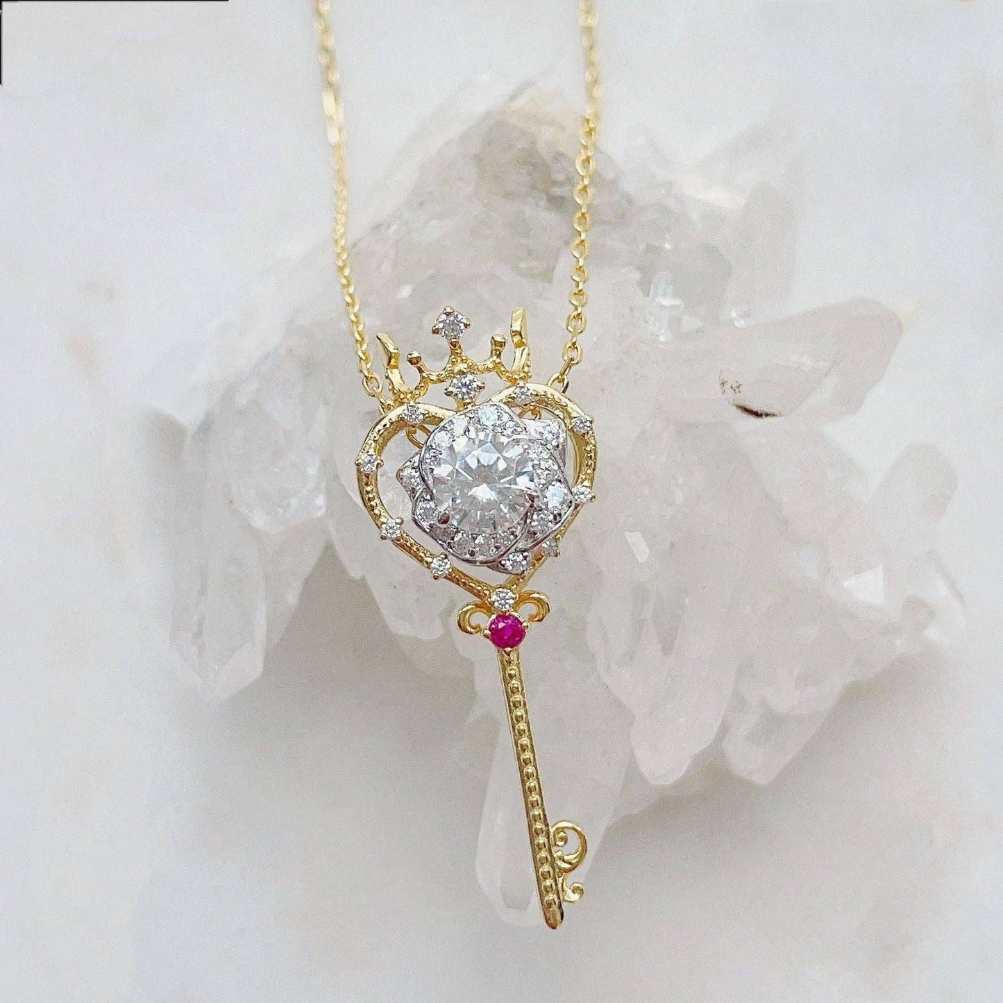 ✦14K yellow gold vermeil ( 14K yellow gold plated over a sterling silver base) ✦ Chain: 16.9 inches + 0.7 (43+2cm extension) ✦ Key Pendant: 32mm (height) 12mm (width) ✦ Key Pendant Accent Stone: 2mm Ruby ✦ Rose Pendant: 8mm ✦ Rose Pendant Center Stone: 5mm White Topaz