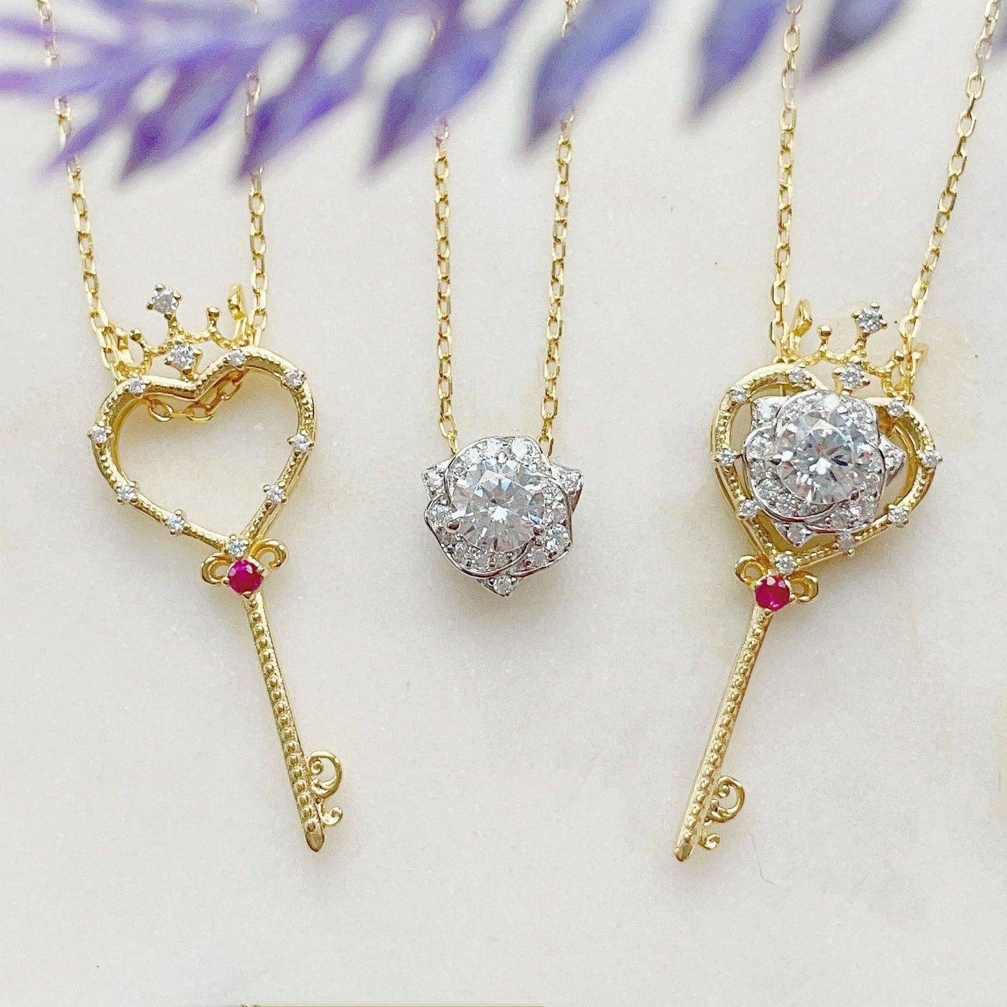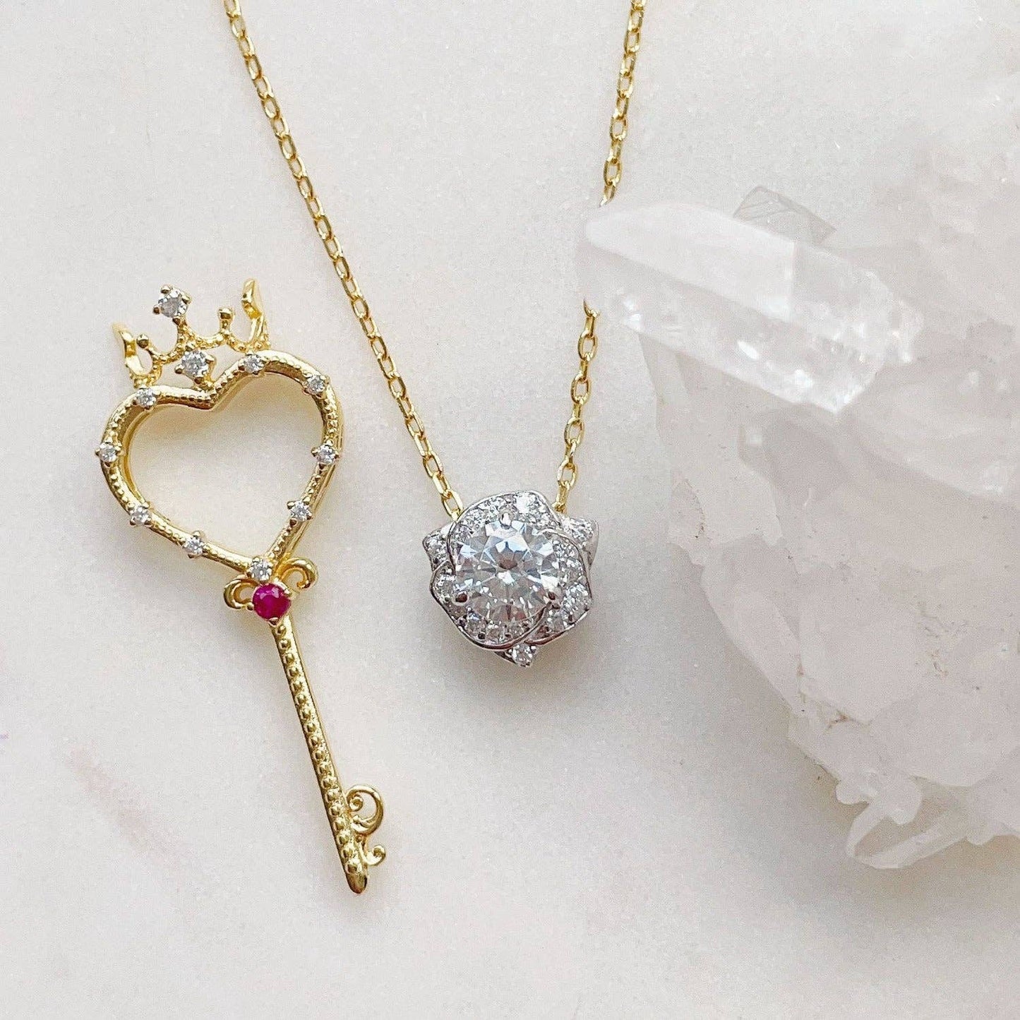 Our Rosa Key Three-Way Necklace features a crowned heart-shaped key pendant with a round ruby gemstone at the center and a white topaz rose flower charm. The key represents unlocking one's heart while the rose flower symbolizes purity and devotion. A versatile necklace that can be worn in three ways. You can wear the heart key alone for a subtle and elegant look, the glittering rose flower alone for a more feminine look, or both the key and the flower together for a more striking look. A meaningful necklace that makes a perfect gift for someone you love and want to keep close to your heart or a self-love treat to remind you that you are capable to unlock endless possibilities.