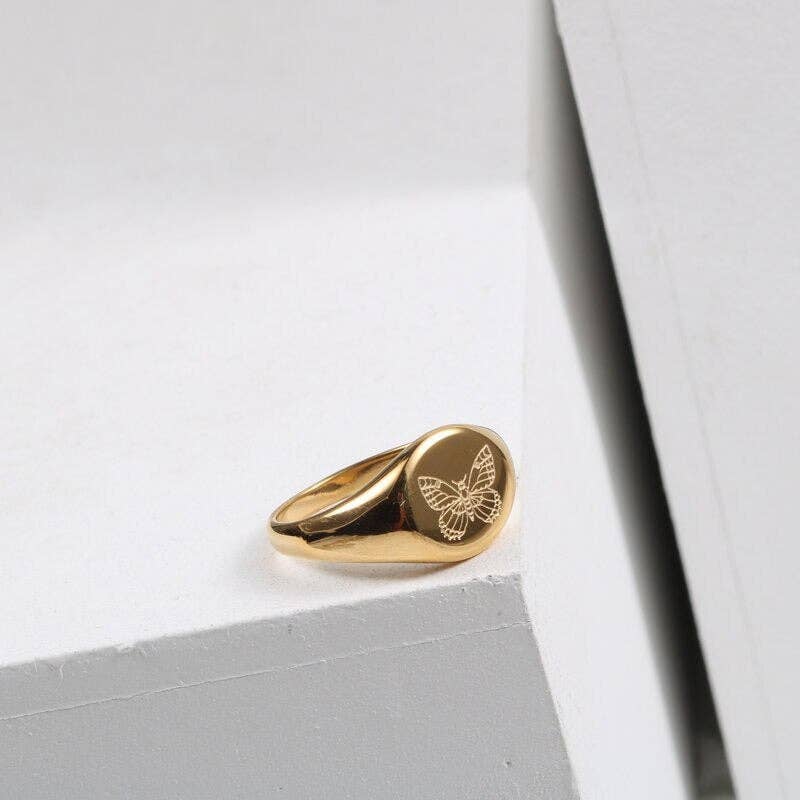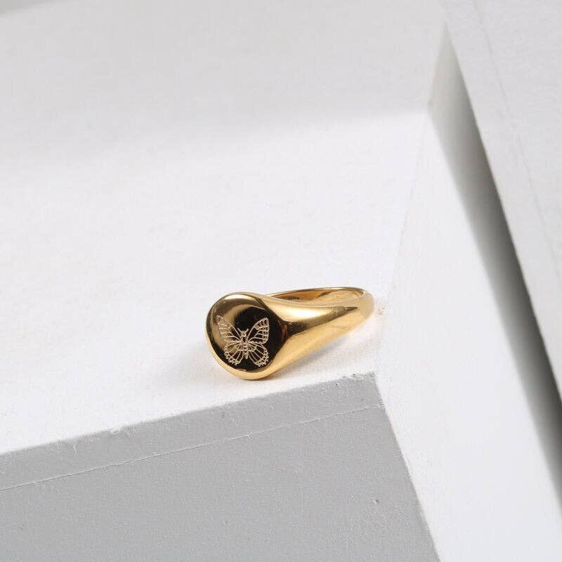 经典厚实金雕花蝴蝶戒指。完美的简约现代珠宝。厚实的设计与复古风格相得益彰,可搭配简约的极简服装。完美的礼物!谁不喜欢蝴蝶呢
