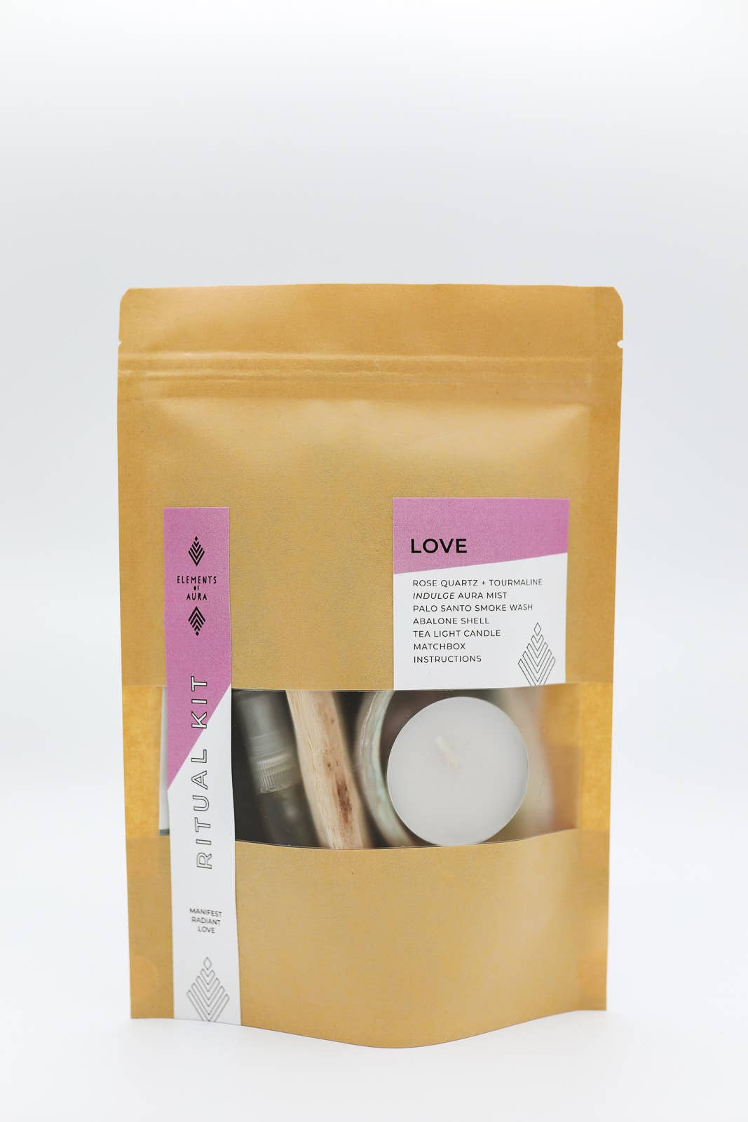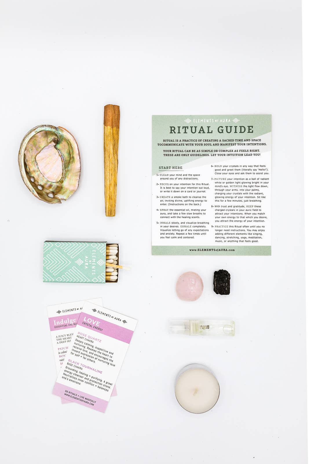 套装内含:玫瑰石英 + 黑色碧玺水晶 + 水晶信息卡 Indulge 精油喷雾 + 精油信息卡 圣木烟熏洗液 鲍鱼壳茶灯蜡烛 EOA 火柴盒 仪式指南和说明