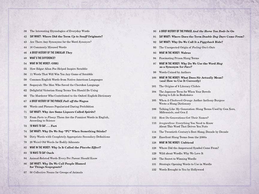From Mental Floss, the premier destination for curious minds comes a deep dive into the the world of words! You’ll discover the surprising (and sometimes very dark) origins of common terms, a guide to quirky old-timey words, a timeline of popular slang , tips & tricks to win at every word game, from Scrabble to Wordle, a collection of the best literary insults, and much more!