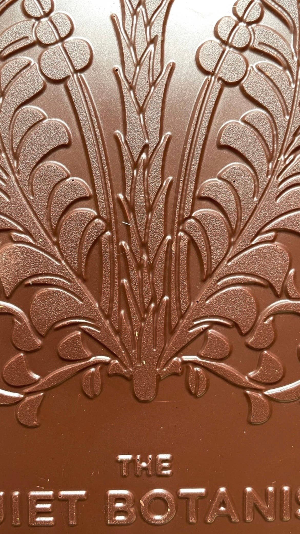 Wrapped in vintage botanical print paper, this large bar reveals an elegant moody gold sleeve which complements its botanically stamped chocolate