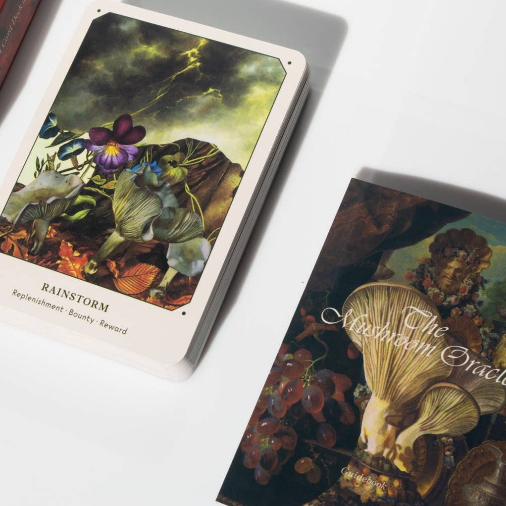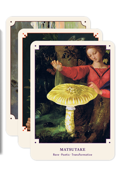 蘑菇神谕卡牌通过 44 张卡片和一本随附的小册子引导菌丝思考过去、现在和未来,这些卡片和小册子代表蘑菇、森林、蘑菇人和真菌结构,以及每个卡片所包含的众多事物、层次和联系。通过在新的开始、岔路、关闭和季节转换时抽一张卡片来咨询蘑菇神谕。